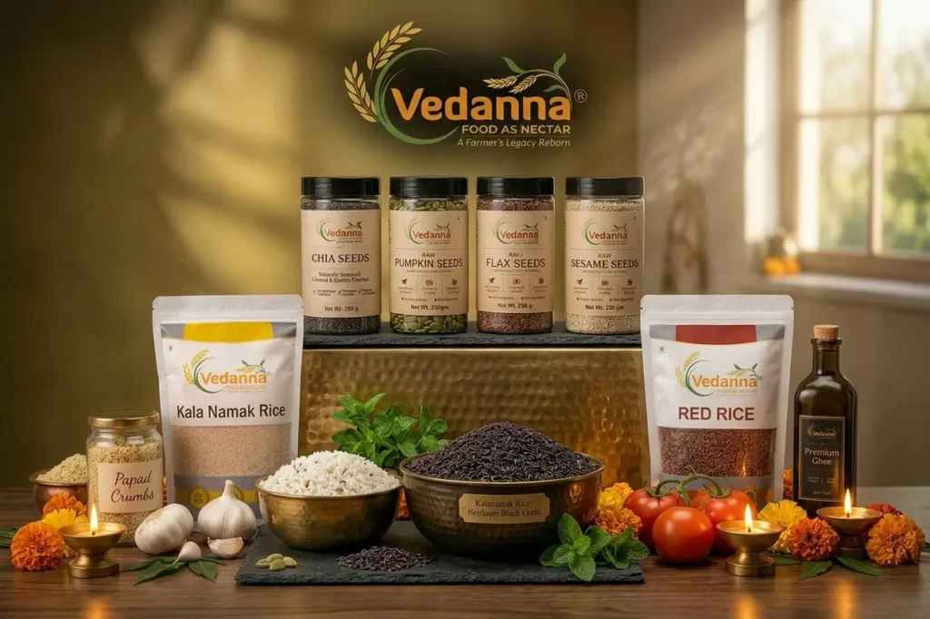 Buy GI Tagged Kalanamak Rice, Red Rice, Chia Seeds & Flax Seeds online — direct from farmers. 100% natural, no preservatives. Free delivery above ₹699. — Use Code VEDANNA10