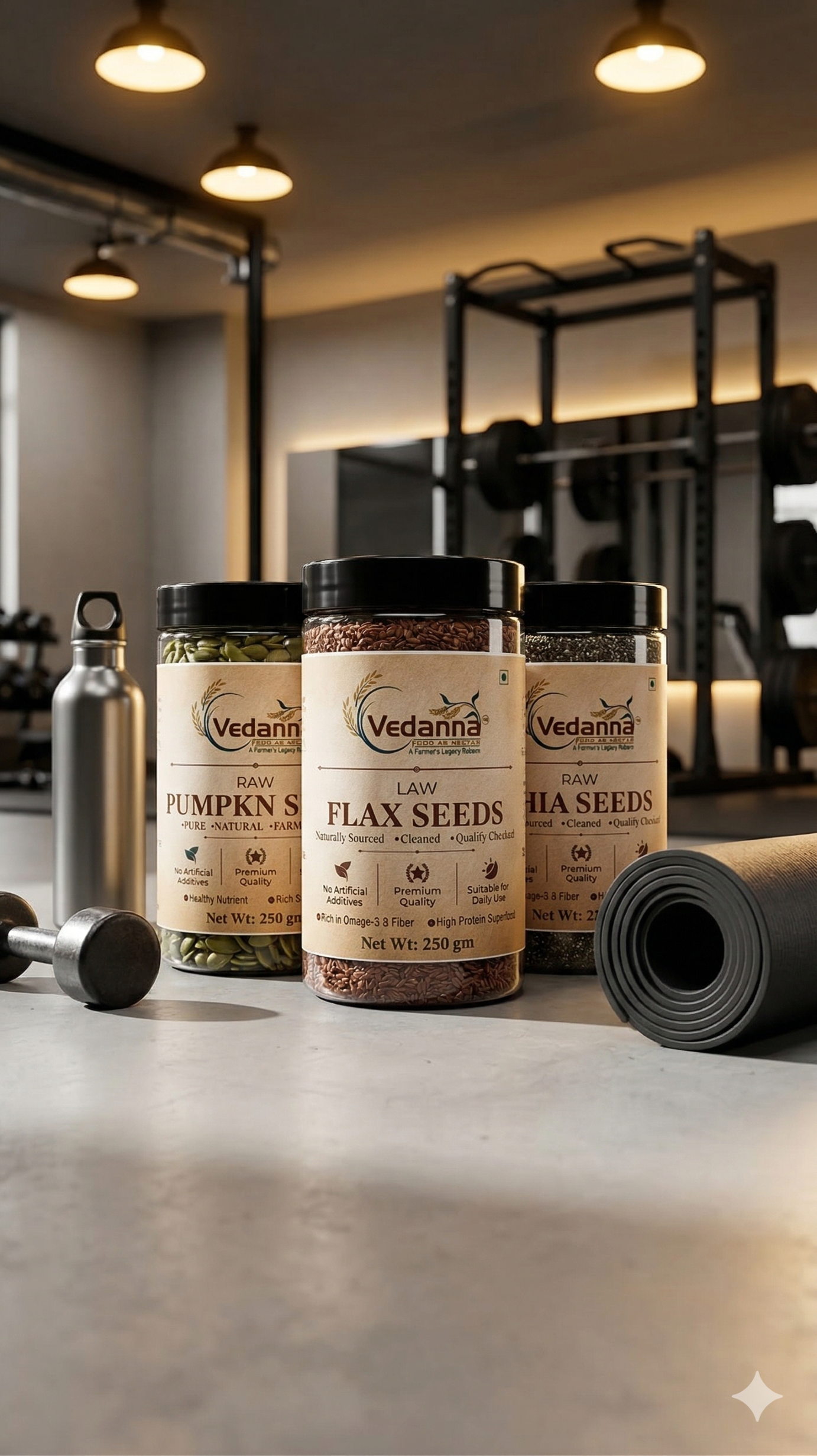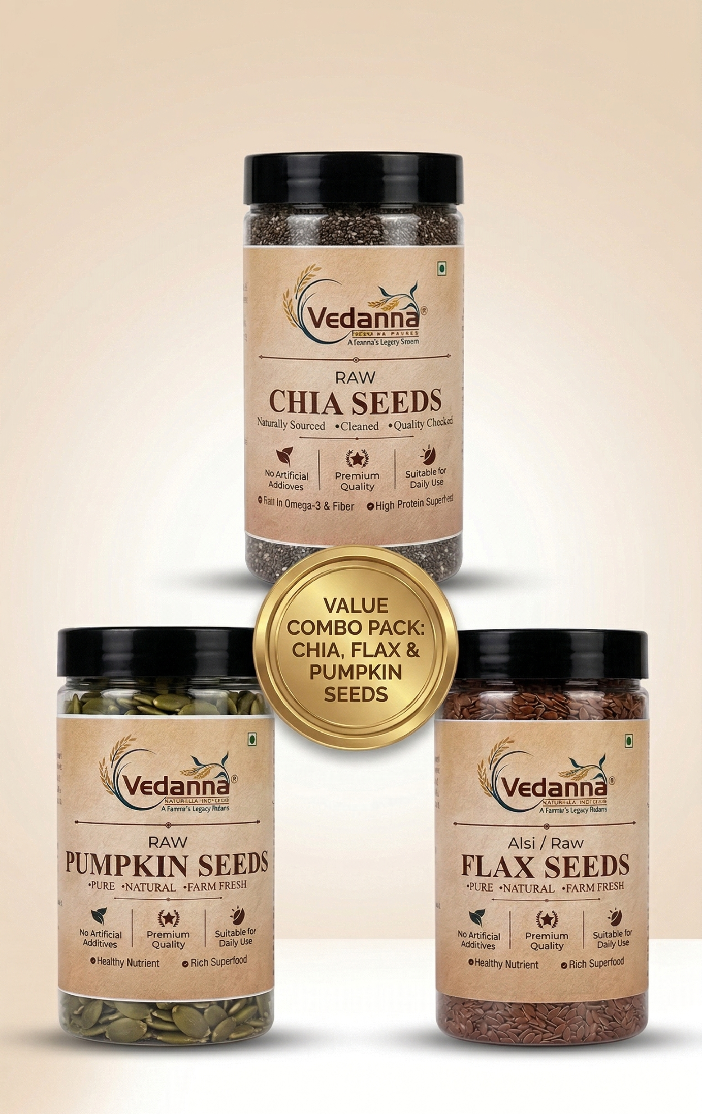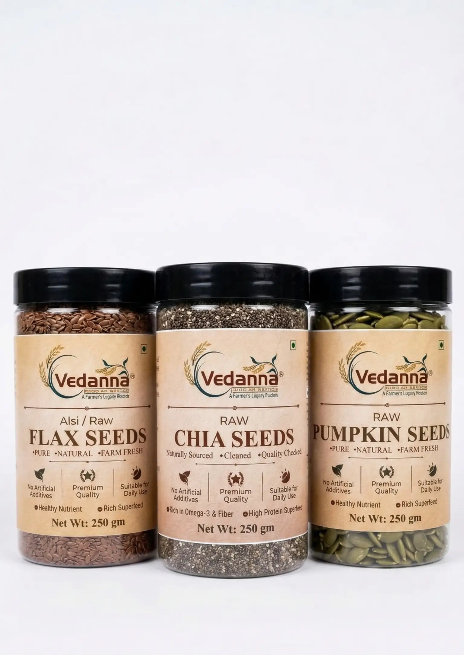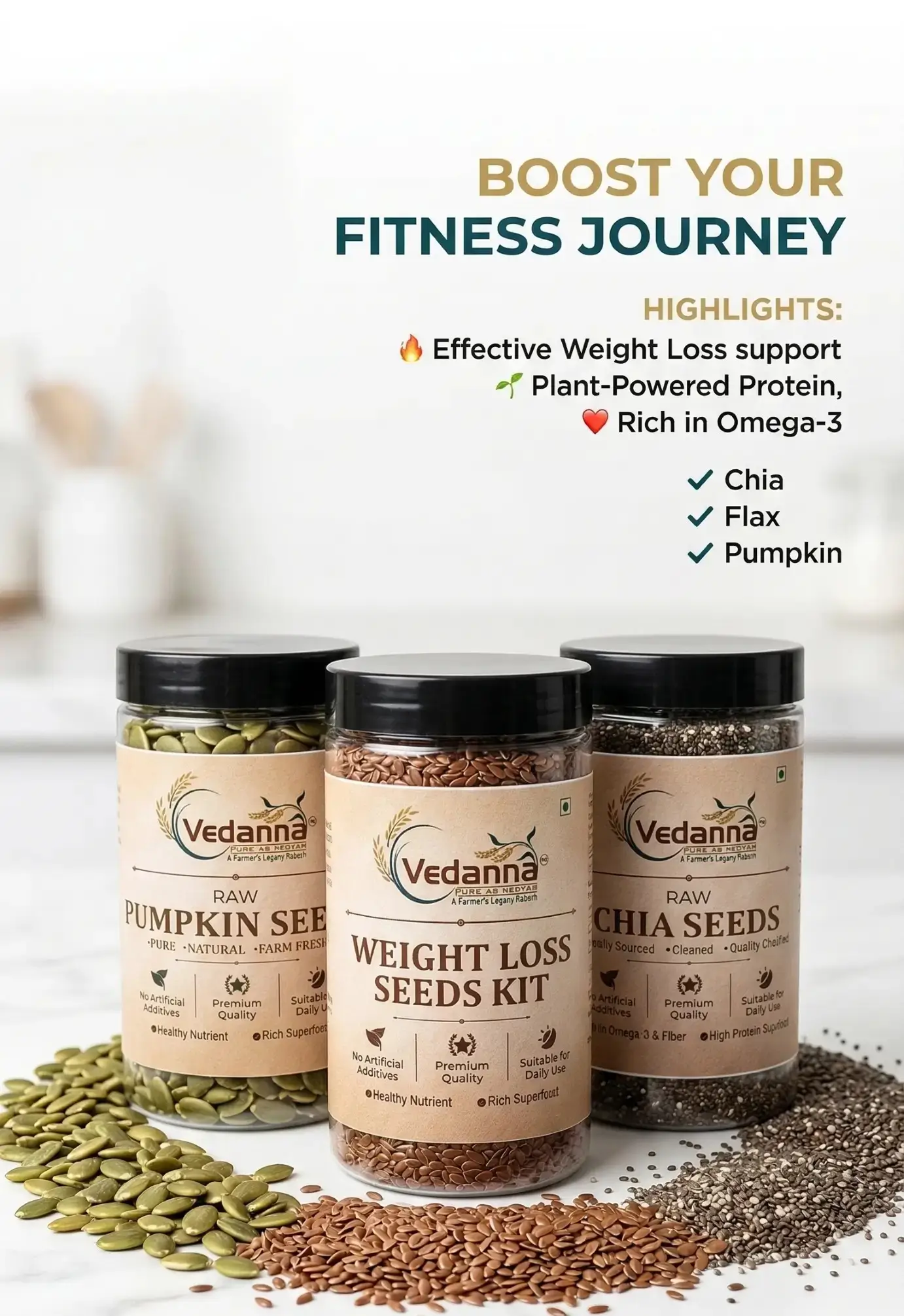 The Vedanna Weight Loss Seeds Combo is your all-in-one superfood solution for weight loss, metabolism boost, and healthy living. This premium weight loss seeds combo includes Chia Seeds 150g + Flax Seeds 150g + Pumpkin Seeds 100g, carefully curated to support your fitness and wellness goals every single day.